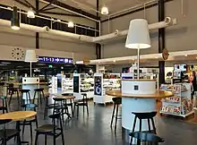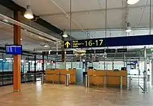 The old terminal of the airport was demolished in 2005 for more apron space and a major extension of the main terminal was completed in September 2011.[5] Four new jetbridge gates (gates 13–16) were constructed and the main terminal was expanded by 4,300 square metres (46,000 sq ft), raising the capacity of the airport to 1.5 million passengers per year. The terminal has three cafes, one before security and two in the gate area which also has a bar "Oluthuone Toppila" and a duty-free shop. There's also a designated smoking area and a grand piano that can be played by visitors.[6]