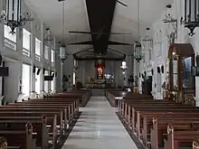 The church was heavily damaged by American and Filipino military bombers on March 15, 1945, during World War II.[2] A replica of the church was constructed over its ruins, without the original dome, with the help of Manila Pagsanjenos under the leadership of Engr. German Yia and Dr. Rosendo Llamas.[2] Serious restoration efforts after the war took place in 1965 under Lipa Archbishop Alejandro Olalia. On April 6, 1969, Bishop Pedro Bantigue blessed the rebuilt church and consecrated the main altar.[4] Due to the devotion of the people of Pagsanjan and nearby towns, the Diocese of San Pablo declared Pagsanjan Church as the Diocesan Shrine of Our Lady of Guadalupe in 2012. Under the term of Monsignor Castillo from 2013 to the present, further renovations were carried out, including the church patio and construction of the choir loft and church gate.