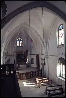 The existing building is gothic in style and consists of a square nave, with a semi-octagonal apse, cross vaults an arch covering the western part, a bell tower (built in 1860) and convent buildings to the north of the church. To the east of the nunnery buildings is the sarcophagus of Lady Dampierre, an Abbess of the nunnery. A number of tomb slabs in the floor of the church dating from the 14th and 15th centuries were noted in the nineteenth and early twentieth centuries, but these were lifted in the 1960s as a conservation measure and kept in the north porch.[5]