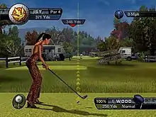 Outlaw Golf supports single player and multiplayer with 1-4 players, and Outlaw Golf 2 supports single player, online and offline multiplayer with 1-4 players. Players take control one of several characters, each with their own unique caddy. The series is noted for its crude humor, particularly in regard to the characters, most of whom fall under an exaggerated archetype. These include a stripper, a hippie, a biker, and more. Unique to the series is the Composure Meter. As players do well, the player character's composure meter increases. The maximum distance rating for each club increases or decreases in relation to the player character's composure. This is designed to simulate frustration: the more shots missed, the more frustrated the player character gets and the worse they perform. In order to counteract this, the player character can beat or humiliate their caddy in some way, which raises the composure meter. Hitting a perfect shot results in the ball bursting into flames as it travels; the flames extinguishing when the turn is over.[5] Outlaw Golf 2 includes new courses and additional golfers and caddies.