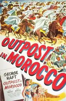 Outpost in Morocco is a 1949 American action adventure film directed by Robert Florey, starring George Raft and Marie Windsor. Paul Gerard (Raft), a Moroccan Spahi officer and his French Foreign Legion garrison, holds off attacks from the native tribes of the Emir of Bel-Rashad (Eduard Franz), the father of Cara (Windsor), the woman he loves.[1] As a rarity amongst American films of the Foreign Legion genre, the Legion cooperated with the producers. A second unit led by Robert Rossen filmed scenes in Morocco.[2] Some of the large-scale action scenes of the film were reused in Fort Algiers and Legion of the Doomed.