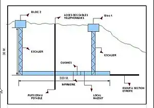 A separate entry block was planned, adjacent to the Villy Est casemate. The underground gallery system at La Ferté is simple, limited to a gallery linking the two blocks, which were initially designed to function as separate units with separate generating plants and ventilation facilities in each block. The 275-metre (902 ft) gallery contained some shared facilities, such as a kitchen, a laundry and an infirmary, at an average depth of 24 metres (79 ft) below the surface. The gallery's small size made it most useful as a link, rather than as the garrison, magazine, command post and long-term shelter afforded by the gallery systems of most Maginot ouvrages. Unlike most ouvrages, La Ferté's living spaces were near the surface in the two combat blocks.[5] A more typical Maginot position would have such spaces under 30 metres (98 ft) of earth or rock cover.[12] Unlike many Maginot positions, the main drain at La Ferté was not configured as an emergency exit.[5] The mixed-arm turret used on Block 2 was known to be mechanically trouble-prone, and La Ferté's turret particularly so.[13]