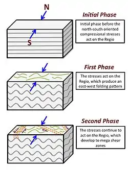 Regionally, there are two separate phases of tectonic evolution. Initially, the Regio was at a stable state where there are no stresses acting on the crustal plateaus. This state was then followed by the first phase in which the north–south-oriented compressional stresses acted on the Regio and produced an east–west folding pattern. This pattern provides the primary structural framework in Ovda Regio. Then, the second phase took place in which the compressional stresses intensified and developed significant mega shear zones.[7]