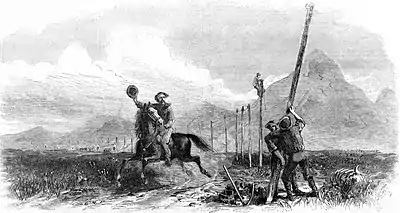 Construction started on June 20, 1861 at Fort Churchill and simultaneously from Salt Lake in July. James Gamble—who was managing the work—wrote, "The line was first measured and staked off; the hole-diggers followed; then came the pole-setters, and next the wire party." Between three and eight miles of line were strung per day.[3] The older telegraph line (originally built by the Placerville and Humboldt Telegraph Company) between Placerville, California and Fort Churchill was also replaced.[4]