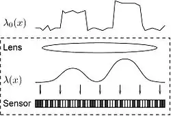 Consider a simplified camera model shown in Fig.1. The is the incoming light intensity field. By assuming that light intensities remain constant within a short exposure period, the field can be modeled as only a function of the spatial variable . After passing through the optical system, the original light field gets filtered by the lens, which acts like a linear system with a given impulse response. Due to imperfections (e.g., aberrations) in the lens, the impulse response, a.k.a. the point spread function (PSF) of the optical system, cannot be a Dirac delta, thus, imposing a limit on the resolution of the observable light field. However, a more fundamental physical limit is due to light diffraction.[9] As a result, even if the lens is ideal, the PSF is still unavoidably a small blurry spot. In optics, such diffraction-limited spot is often called the Airy disk,[9] whose radius can be computed as
