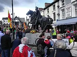 For around 20 years, residents of the town of Corwen in Denbighshire have been celebrating its link to Owain Glyndŵr. Townspeople annually gather at the equestrian statue of Glyndŵr in Corwen town square on the date of his proclamation in 1400. The day's event includes a procession and wreath-laying ceremony and later a service held at the local church.[14]
