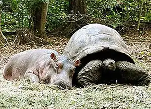 Owen and Mzee are a hippopotamus and an Aldabra giant tortoise, respectively, that became the subject of media attention after forming an unusual bond of friendship. They live in Haller Park, Bamburi, Kenya.[1]