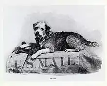 Owney (ca. 1887 – June 11, 1897), was a terrier mix[1] adopted in the United States as a postal mascot by the Albany, New York, post office about 1888. The Albany mail professionals recommended the dog to their Railway Mail Service colleagues, and he became a nationwide mascot for nine years (1888–1897).[2] He traveled over 140,000 miles throughout the 48 contiguous United States and around the world as a mascot of the Railway Post Office and the United States Postal Service. He was the subject of commemorative activities, including a 2011 U.S. postage stamp.[3]