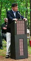 The memorial to Generals Kearny and Stevens are two granite monuments, surrounded by an iron rail with granite posts.[2] Each monument has the general's name carved on one side, and a tributary plaque attached to the other. The monuments are not gravestones but are cenotaphs, as the two generals are buried elsewhere. Neither general died on the exact spot; Stevens was killed nearby and Kearny died about 150 yards (140 m) southwest of the park. The plot of land containing the memorial is not officially part of the park as it is still owned by its trustees, but the park almost certainly would not exist today without them.[9] The plaques read: