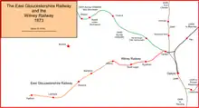 • Witney; the passenger station was the new, through station built by the East Gloucestershire Railway; the original Witney Railway terminus was a goods station on a short spur.