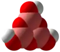 - Modification III, or trimeric, with the molecular formula H3B3O6. The molecule has C3h symmetry, with a six-member ring of alternating boron and oxygen atoms at the core, with OH groups attached to the borons. The crystal structure is orthorhombic with a sheet-like structure, similar to that of boric acid itself.[3] It is obtained by heating orthoboric acid at 80-100 °C, with loss of water:[3]