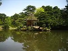 The garden was first established in the 1380s. In the 1430s Ashina Morihisa, the 10th feudal lord of the Ashina clan, believing it to be a sacred place, kept the garden as a villa.[2] In 1670, Hoshina Masatsune, the second daimyō of the Aizu Domain, cultivated various herbs in the garden, notably Korean ginseng. Private citizens were encouraged to grow herbs as well, so the garden became known as Oyakuen, or "medicinal herb garden".[3] Today there are about 400 kinds of medicinal herbs and trees cultivated in and around the garden. Meguro Jotei, a landscape gardener during the Edo period and disciple of Kobori Enshū, designed the current layout of the garden to show nature in miniature, which is typical of a Japanese garden. The garden pond is named Shinji no Ike and is shaped like the kanji character for "heart" (心). The rectangular garden has a perimeter of about 540 m and an area of about 1.7 ha.[4]