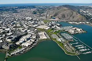 ![]() Aerial photograph of Oyster Point Park and Marina, with San Bruno Mountain in the background. (2012) | |