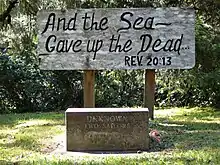 Oysterville cemetery, one of the oldest cemeteries in Washington State, began in 1858 on land owned by F.C. Davis.[1] Located about a quarter of a mile outside the historic gold-rush boom town of Oysterville, this 2-acre cemetery holds plots for many of the founding families of the area. The history hidden in the headstones of this historic cemetery tells the tale of the Shoalwater Bay Tribe that lived in the Shoalwater Bay region; the first pioneers that came, drawn by the oyster industry; their descendants; and countless lives lost in the treacherous mouth of the Columbia, the Graveyard of the Pacific. A memorial to the last Native American chieftain of the Long Beach peninsula sits just to the right of the entrance, and a wooden sign with a marble headstone honors the unknown sailors lost at sea with the beginning of Revelation 20:13, "And the sea gave up the dead".[2]