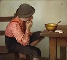 On May 20, 1988, Canada Post issued 'The Young Reader, Ozias Leduc, 1894' in the Masterpieces of Canadian art series. The stamp was designed by Pierre-Yves Pelletier based on a painting "The Young Student" (1894) by Ozias Leduc in the National Gallery of Canada, Ottawa, Ontario. The painting shows the Ozias Leduc's younger brother, concentrating on a picture book, pencil in hand. The 50¢ stamps are perforated 13 X 13.5 and were printed by British American Bank Note Company.[6]