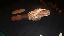The pūtātara is a type of trumpet used by the Māori people of New Zealand. It is customarily made with a carved wooden mouthpiece and a bell made from New Zealand's small native conch shells (Charonia lampas rubicunda) or triton shell (Charonia tritonis).[1] Larger pūtātara were particularly prized as the triton shell was rarely found and only sometimes washed up on the beaches in the Far North.[2] It is often blown in guest welcoming ceremonies.[3]