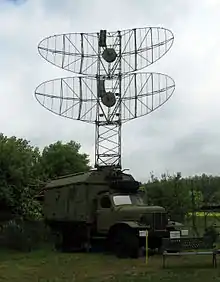 In 1952 SRI-244 started development of what become the P-15 early warning radar; by 1955, the radar had passed state trials and was accepted into service with the anti-aircraft troops of the Soviet armed forces.[1] The P-15 was designed to detect aircraft flying at low altitude and came to be associated with the S-125 "Neva" anti-aircraft system (NATO reporting name SA-3 "Goa"), though it was later replaced by the P-15M2 "Squat Eye" radar which mounted a single radar antenna on a 20-30 meter mast to improve coverage.[2]