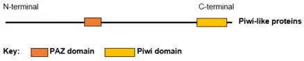The structure of several Piwi and Argonaute proteins (Ago) have been solved. Piwi proteins are RNA-binding proteins with 2 or 3 domains: The N-terminal PAZ domain binds the 3'-end of the guide RNA; the middle MID domain binds the 5'-phosphate of RNA; and the C-terminal PIWI domain acts as an RNase H endonuclease that can cleave RNA.[8][9] The small RNA partners of Ago proteins are microRNAs (miRNAs). Ago proteins utilize miRNAs to silence genes post-transcriptionally or use small-interfering RNAs (siRNAs) in both transcription and post-transcription silencing mechanisms. Piwi proteins interact with piRNAs (28–33 nucleotides) that are longer than miRNAs and siRNAs (~20 nucleotides), suggesting that their functions are distinct from those of Ago proteins.[8]