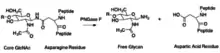 The asparagine residue, from which the glycan is removed, is deaminated to aspartic acid.