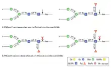 - ↑ Anthony L. , Tarentino and Thomas H. Plummer Jr.. "Enzymatic deglycosylation of asparagine-linked glycans: Purification, properties, and specificity of oligosaccharide-cleaving enzymes from Flavobacterium meningosepticum." Methods in Enzymology. 230. 1994. 44-57. Web.