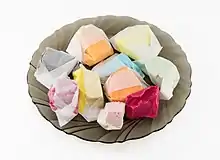 The candy is made of sugar, water, syrup, egg whites whipped with a pinch of salt, gelatin, some kind of flavoring, pink fruit juice (usually raspberry) and potato flour.[1] After the batter is cooked, it is poured onto a flat sheet and, after cooling down, cut into squares about 3 cm wide. Pańska skórka is most often very sweet, with a delicate caramel-almond flavor, if made with the traditional recipe in mind. It is usually white and pink, although nowadays a variety and flavors and corresponding colors can be purchased, including for example cola or bubble gum.[2]