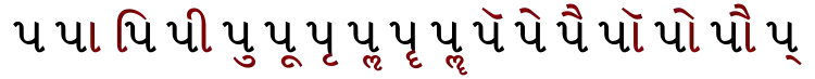 | प | पा | पि | पी | पु | पू | पृ | पॄ | पॢ | पॣ | पे | पै | पो | पौ | प् |