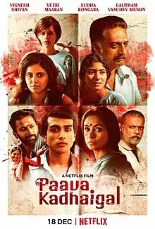 Paava Kadhaigal (transl. Sinful Tales) is a 2020 Indian Tamil-language anthology drama film consisting of four short films directed by Sudha Kongara, Gautham Vasudev Menon, Vetrimaaran and Vignesh Shivan.[1] Through four unique stories, the film explores how pride, honour, and sin influence complex relationships of love.[2] The anthology features an ensemble cast of Kalidas Jayaram, Sai Pallavi, Simran, Anjali with Shanthanu Bhagyaraj, Prakash Raj, Gautham Vasudev Menon, Kalki Koechlin, and others.[3] It released in Netflix on 18 December 2020, to mostly positive reviews from both critics and audience.[4]