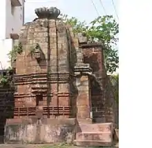 Architectural features (Plan and Elevation): The entire temple is a renovated one. On plan, the temple has a vimana with a renovated frontal porch measuring 3.80 in length and 0.75 in breadth. The temple stands on a low platform which is now buried. The vimana is ancharatha on plan as distinguished by a central raha a pair of anuratha pagas and kanika agas on the either side of the raha. n elevation, the temple has a trianga bada measuring 2.90 metres in height. Pabhaga measuring 0.75 metres has four moulding of khura, kumbha, pata, and basanta. The jangha hat measures 1.65 metres is plain and the baranda is 0.50 metres. The temple is devoid of any culptural embellishment. The mastaka of the temple conforms to the typical Kalingan style hat consists of beki, amlaka, khapuri and kalasa. Raha niche & parsva devatas: The raha niches on three sides uniformly measures 0.80 metres in height x 0.45 metres in width x 0.25 metres in depth, are all empty.
