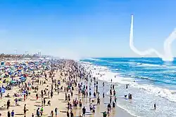 The Pacific Airshow is an annual airshow held in Huntington Beach, California, and Gold Coast, Queensland. Spanning over three days, the Airshow features the best in military and civilian flight demonstrations from international teams, including past performances by the U.S. Navy Blue Angels, U.S. Air Force Thunderbirds, Royal Air Force Red Arrows, and Canadian Forces Snowbirds. The first Pacific Airshow (first called the Breitling Huntington Beach Airshow, then later The Great Pacific Airshow) took place in 2016, attracting hundreds of thousands to Huntington Beach for a display of aviation skill and military might soaring over the beach in Southern California.[2] In only five years, Pacific Airshow has twice been named Civilian Airshow of the Year by the U.S. Air Force Thunderbirds and in 2019 named among the Top 5 Air Shows by USA Today’s 10Best. It has also been recognized as the Civilian Air Show Site of the Year by the U.S. Air Force Thunderbirds in 2022.[3] The event has become a popular fall event for residents and visitors from as far away as Europe and Asia while delivering a more than $105 million economic impact to the City of Huntington Beach.[4]