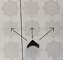 Pieces in Pacru point in a particular direction. When they move, they may move straight ahead or forty-five degrees to the left or right of the direction the piece is facing. The piece ends the move pointing in the direction of movement. Pieces may only land on a field that is unoccupied, or which has a marker of their own colour. The exception is during piece capture (see Capturing below).