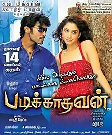 Padikkadavan (transl. Illiterate) is a 2009 Indian Tamil-language masala film written and directed by Suraj and produced by B. Venkatarama Reddy. It stars Dhanush and Tamannaah Bhatia alongside an ensemble supporting cast including Vivek, Atul Kulkarni, Suman, and Sayaji Shinde.[1] The music was composed by Mani Sharma with cinematography by A. Venkatesh and editing by Manoj. Filming began in March 2008, and the film released on 14 January 2009 during Pongal and received a huge positive response.[2] The film was successful, grossing ₹15 crore in Tamil Nadu and established Dhanush as one of the top five saleable heroes of Tamil cinema after then.[3]