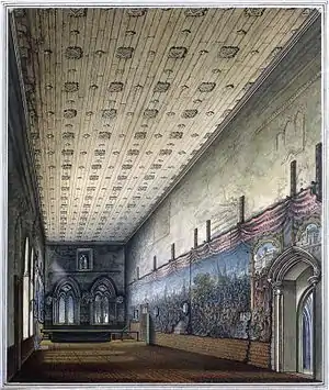 The Painted Chamber was part of the medieval Palace of Westminster. It was gutted by fire in 1834, and has been described as "perhaps the greatest artistic treasure lost in the fire".[1] The room was re-roofed and re-furnished to be used temporarily by the House of Lords until 1847, and it was demolished in 1851.