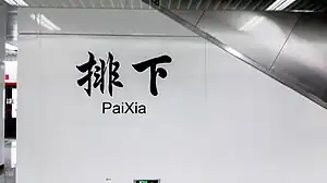 Paixia Station (Chinese: 排下站; pinyin: Páixià zhàn; Fuzhounese: [pɛ˨˩ ɑ˨˦˨]) is a metro station of Line 1 of the Fuzhou Metro. It is located on the south of the intersection of Fuxia Road and South 3rd-Ring Road in Cangshan District, Fuzhou, Fujian, China.[1] It started operation on May 18, 2016.[2]