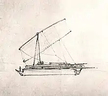 Pajala is an undecked coasting boat which usually has a tripod mast carrying a single large tanja sail. It is carvel-built, and like other Austronesian boat, it is a double ender (the bow and stern of the boat is sharp, i.e. having stem and sternpost).[2]: 22–23 The bow and stern were similar in shape, usually turn sharply because the board is cut, not bent, into shapes. The pattern of the planks indicates that it was no different from traditional boats from 1000 years ago. The first plank is longer than the keel. The plank is arranged from corner to corner with internal dowels. While mainly deckless, there is a low deck abaft the stempost, behind it is a place for washing.[3] It is built using smooth curved planks, with double quarter rudders, used as a frame and the ribs are placed thereafter.[1]