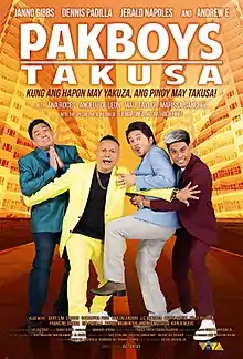 Pakboys Takusa is a 2020 Philippine comedy film produced by Viva Films starring Janno Gibbs, Dennis Padilla, Andrew E, and Jerald Napoles. Directed by Al Tantay. It is one of the official entries of the 2020 Metro Manila Film Festival.[1] The film was premiered on December 25, 2020.