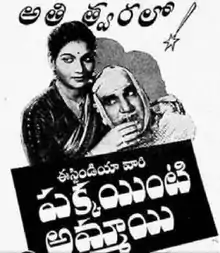Pakka Inti Ammayi is a 1953 Indian Telugu-language romantic comedy film directed by C. Pullayya.[1] The film featured Anjali Devi as the beautiful neighbour girl. Famous comedian Relangi acted as her lover Subbarayudu and veteran South Indian singer A. M. Rajah as his friend. It was produced by East Indian Company.