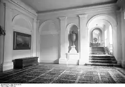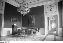 Among the residents of the first group are the respective holders of the office of the Reich President. In addition to the Reich President Ebert and von Hindenburg, the head of the head of state's office, State Secretary Otto Meissner, was constantly at home in the palace from 1920 to 1939. There were also the families of these three men. During Ebert's presidency, his wife and two sons lived in the palace, while Hindenburg brought his son Oskar and his daughter-in-law Margarete and the couple's three children, of whom the youngest was born in the palace with. Meissner's household consisted of his wife and two children, including the son Hans-Otto Meissner. Other people who not only worked in the palace, but also had their own apartments there, were the house inspector (chief of domestic staff) Wilhelm Tappe, Hindenburg's personal servant Oskar Putz (called "Karl" um) To avoid confusion with the son of the same name of the head of state) and the presidential chauffeur Otto Demant and the chauffeur of the president's office Kurt Nehls. [7]