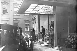 On the forecourt at the front of the palace was a so-called “courtyard” covered with gravel, on which the Reich President received foreign ambassadors and heads of state as well as other distinguished guests. In later years it was common for a twenty-member honorary formation of the Reichswehr to take a stand on the courtyard whenever the President entered or left his office. In the courtyard there was a fountain decorated with allegorical figures, behind which a wide glass staircase led to the entrance to the palace.