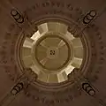The lobby features a central hall adorned with inscriptions in Latin verse and monster statues. It radiates out from a central dome into nine vaulted archways; these represent the nine circles of hell as described the Inferno. The first three floors have geometric figures representing the alchemical symbols for fire, the colors of the Italian flag, and various Masonic symbols on the walls and floors. The lobby also has operational antiquated elevators.[4]