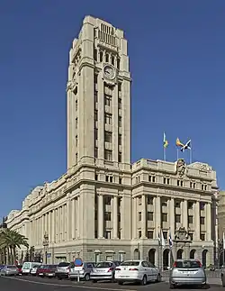 Palacio Insular de Tenerife (English: Insular Palace of Tenerife) is a building in the Spanish city of Santa Cruz de Tenerife, home of the Cabildo de Tenerife. Designed by the architect José Enrique Marrero Regalado, and executed between 1935 and 1940, it is located in the Plaza de España.[1] The building stands out for its tower topped by a clock commissioned in 1950 and is one of the most recognizable symbols of the city of Santa Cruz de Tenerife.
