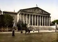 The Palais Bourbon (pronounced [pa.lɛ buʁ.bɔ̃]) is the meeting place of the National Assembly, the lower legislative chamber of the French Parliament. It is located in the 7th arrondissement of Paris, on the Rive Gauche of the Seine, across from the Place de la Concorde.