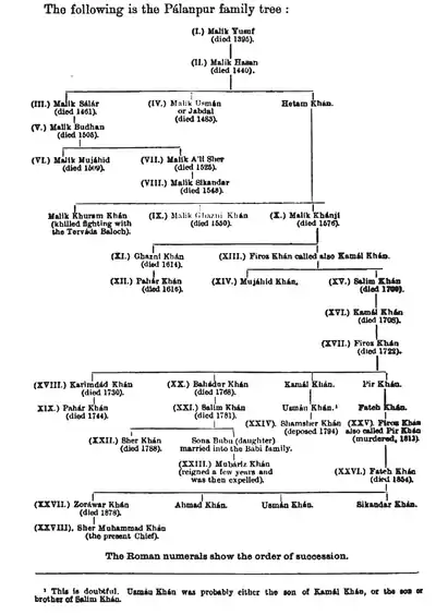 The rulers of Palanpur State belonged to the Lohani tribe (Hetani, Bihari Pathan) of Jalori dynasty.[5] All rulers used the title of Diwan except the last two rulers who used the title of Nawab.