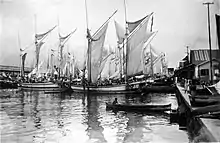In the 18th century, Bugis people sailed a type of perahu similar with patorani. The hull is from pajala type, the rig is using a canted triangular sail in a tripod mast, with weight less than 50 tons. Many of them can bee seen in Australian beach collecting teripang between 1800–1840.[5] In 1880, a boat dubbed "Bugis prahu" seems to have been the prototype of palari hull. It was a midway development to palari, with western-styled deck but with traditional (indigenous) stern (the ambeng stern). A bowsprit and jibsail has been added, but it's still using a tanja sail on a single tripod mast. There was no cabin at the stern.[6]