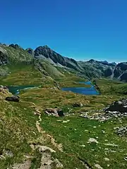 This area consists of several lakes, all of which were formed through glacial excavation: Lac Long (2,720 m (8,920 ft), located below the Bussola Pass, French for "Long lake"); Lac Potcha (2,518 m (8,261 ft)), which is located at the foot of the Palasinaz hill. The view from the Lac Potcha is wider than the view from the other lakes due to its higher altitude; Lac du Couloir (2,606 m (8,550 ft), French of "Corridor Lake"), whose waters, together with those of Lac Vert (2,485 m (8,153 ft), French for "Green Lake"), flow into the Lac de la Bataille (2,485 m (8,153 ft), French for "Lake of the Battle"). This last lake is the largest of the group and is characterized by a trapezoidal shape and a large promontory that almost divides the entire lake in two.[1] The Lac du Couloir (2,606 m [8,550 ft]) is located in a small glacial excavation basin.[2]