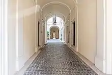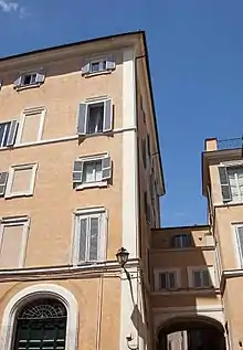 The perspective vision that is obtained creates a sort of apparently inexplicable optical effect. In fact, moving backwards from the main entrance door of the Palace, the front entrance of the Church of Santa Maria in Campitelli begins to "move" from left to right until it coincides perfectly only when you reach the threshold of the door of the Palazzetto. It is necessary to underline that at the time of planning the facade of the current Church had not yet been built and that the birthplace of Blessed Ludovica Albertoni,[7] the true spiritual authority of the family, was located on the same site. The Paluzzi Albertoni had therefore probably wanted to keep the view from door to door to keep a constant memory of the Blessed. A part of the perimeter wall of the house of the Blessed is still visible with an ancient fresco inside the Chapel of the Albertoni family in Santa Maria in Campitelli.[8]
