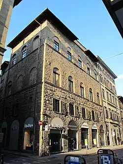 Mazzino Fossi[4] specifies: 'The main body is at nos. 11r-21r and on the Piazza dell’Olio. There where n. 1 is, the building, with medieval traces on the ground floor, has a 19th-century makeover'. At the end of the 18th century (and again at the beginning of the next) the hotel of the Black Eagle was here. On the side of Piazza dell’Olio is a recent memorial (placed there in 2006) in memory of Wolfgang Amadeus Mozart's stay in that hotel during his first trip to Florence in 1770.
