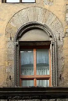 «One of the buildings that preserves almost intact the severe and grandiose character of the Florentine palaces of the Middle Ages […]. The façade is entirely of strong stone, the arched bar windows are lined by robust recurring cornices, while the ground part consists of a series of large arches supported by piers, each supported by rusticated ashlar stone. In the 15th century it was perhaps thought to give it a less severe and more elegant appearance, but the work begun with the beautiful decorations of a window, was interrupted, and the palace, less minor disfigurements, has come down to us with its original 13th-century forms».[3]