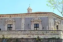 After the devastations of the 1693 Sicily earthquake, the Prince of Biscari, Ignazio Paternò Castello, 3rd Prince of Biscari, obtained the permission to build this palace. At the time the building stood against the French king Charles V's walls of the town. After Ignazio's death in 1699, his son Vincenzo (1685-1749) and later his nephew Ignazio Paternò Castello (1714-1786), the fifth Prince of Biscari extended and completed the decoration. This latter prince complimented the work with a museum space to display his large collection of mainly archeologic and numismatic collections, now on display in the Museo Civico Castello Ursino.[1]