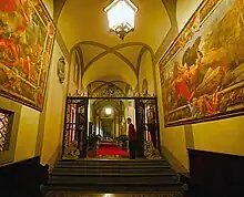 The Del Puglieses, a distinguished family of the Florentine Republic, owned a residence in that area from the early fifteenth century and enlarged it in 1428 by acquiring eight additional smaller apartments, which the previous owner, Niccolò Serragli, had already unified under a single roof. The Del Puglieses are remembered for their patronage of the arts and Giorgio Vasari writes that, in this location, Piero di Cosimo painted a number of stories on the walls of a room, and Fra Bartolomeo a mounted St George atop a flight of stairs.