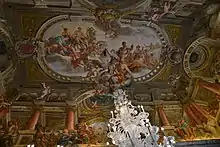On the upper floor are 16th century frescoes by the Semino and Calvi brothers. The most famous works, however, are the fresco cycles by Domenico Piola and Giovanni Battista Carlone, among the highest achievements of Genoese Baroque. In the hall on the piano nobile, accessed by climbing an elegant staircase, the volta was frescoed at the end of the 17th century, with a mythological subject depicting The offering to Jupiter of the keys of the temple of Janus, with an allegorical meaning extolling peace, executed by the Genoese Domenico Piola and the Emilian Paolo Brozzi, a specialist in perspective quadratures. The decorations in the other salons are also inspired by Roman history. Again Piola, a dominant artist in the second half of the 17th century in Genoa, is the author of the vault with The Sibyls show the Virgin Mary to Augustus, a Christian reinterpretation of pagan themes, surrounded by episodes depicting The Seasons. Giovanni Battista Carlone was active in two other salons, with Episodes from the Life of Lucretia (Ancient Rome), Coriolanus, and the Rape of the Sabine Women'.[1]